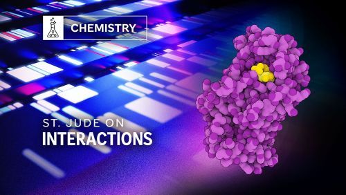 An artistic rendering of pharmacogenomic information, paired with the structure of NUDT15, a protein that St. Jude researchers discovered affects sensitivity to a major pediatric cancer drug. Graphic by Briana Williams.